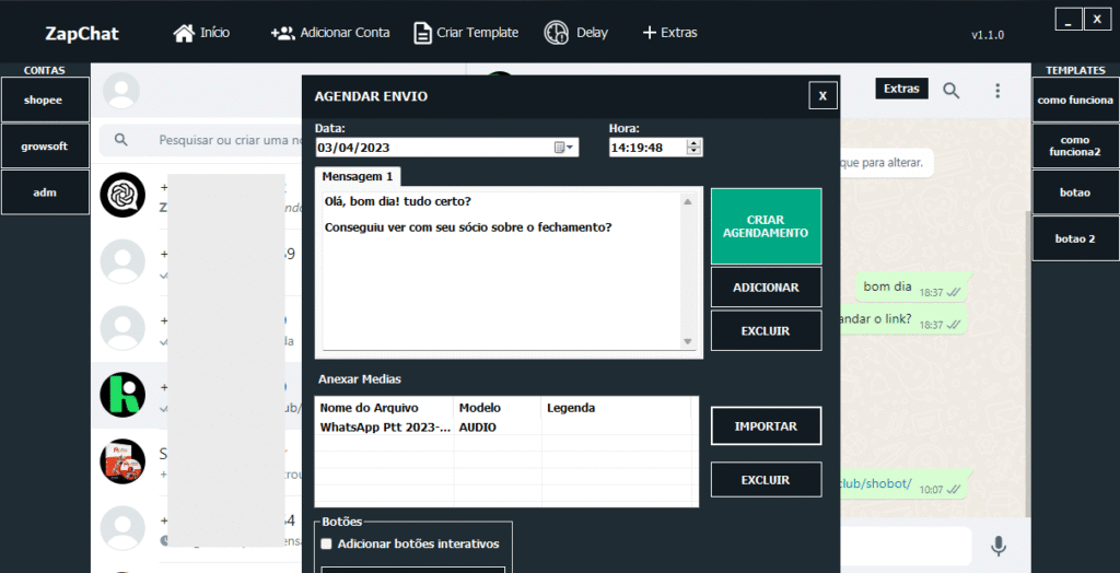 Grave diversas mensagens já prontas para serem enviadas com apenas um clique. Adicione textos, imagens, vídeos, áudios gravados e até mesmo botões interativos.